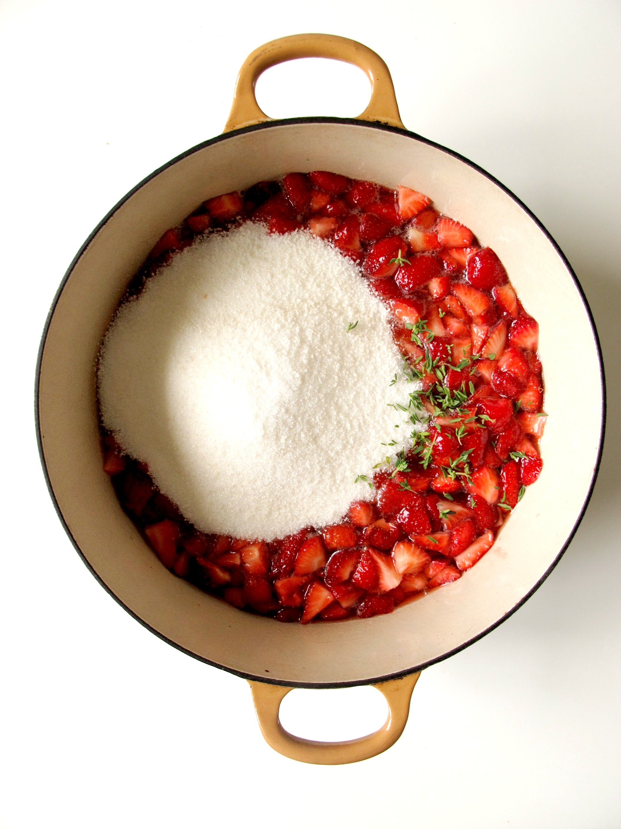 2. The day you wish to make the jam, pour the strawberries and the sugary juices into a large pot (like a le creuset) or a traditional berry pan and stir in the thyme leaves, lemon juice and the remaining sugar.
