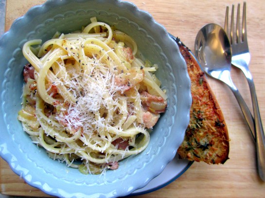Smoked Bacon Carbonara with Parmesan Garlic Toasts
